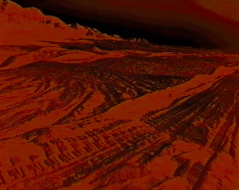 Sladjan Nedeljkovic found five unspectacular photos of landscapes on the internet and processed them digitally. Pictures of mountains, deserts, but also indiscernible motives, which could come from a waste deposit, a junkyard or a war zone. By giving them a red shade, inverting the colours and making them blurry, the artist created a surveillance camera aesthetics, which emphasizes the mediality and artificiality of the photos.