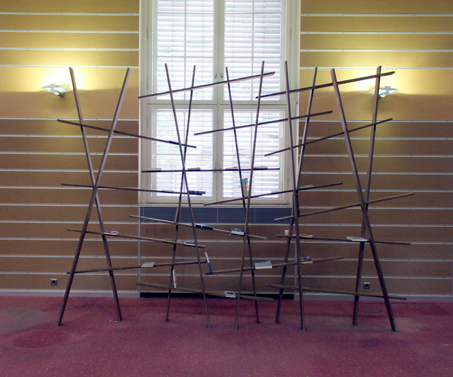 On occasion of the group show "Bank, Blank" - the main show during 48H Neukölln art festival - that was curated at a disused former 'Sparkasse' bank space, the artist Sladjan Nedeljkovic created a participatory installation. It comprises a free-standing book shelf with a selection of books chosen by Nedeljkovic. This large-scale structure occupies a space between a fragile sculpture and a purpose-built everyday object. The boards seem casually and quickly stacked on top of each other, defying the laws of craftmanship and functionality. They strongly incline and allow light to penetrate through the boards. Alike a play with the rules of physics, challenging the instable nature of the sculpture, the artist placed single books on the inclining boards.